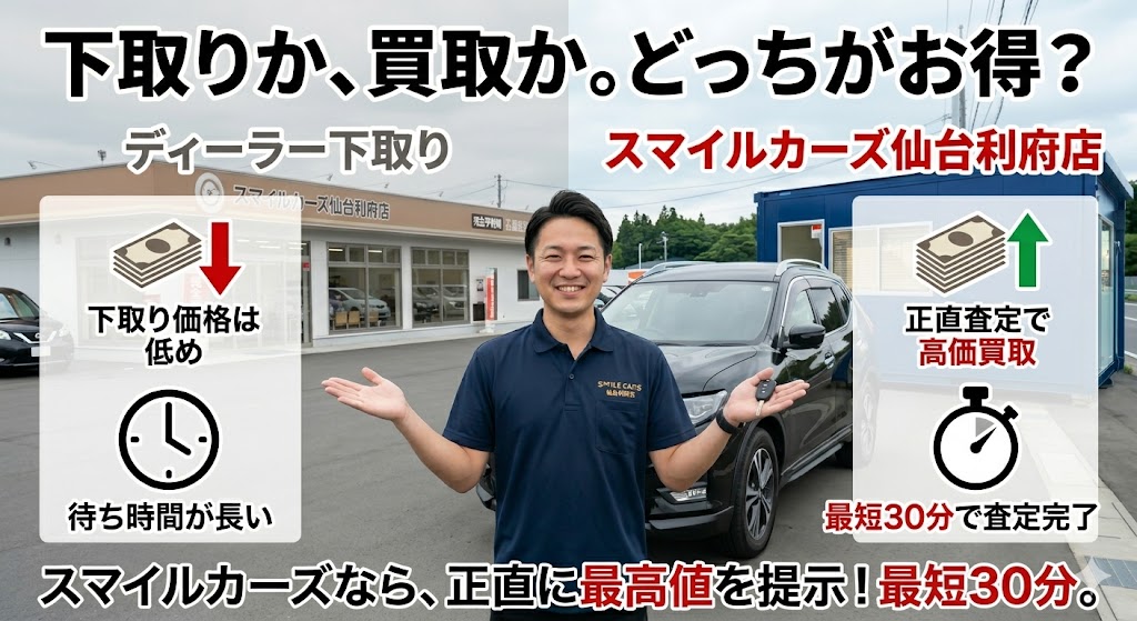 【仙台・利府の車買取】ディーラー下取りは損?買取専門店が「数万円高く」買い取れる理由と、30分で完了する正直査定の秘密